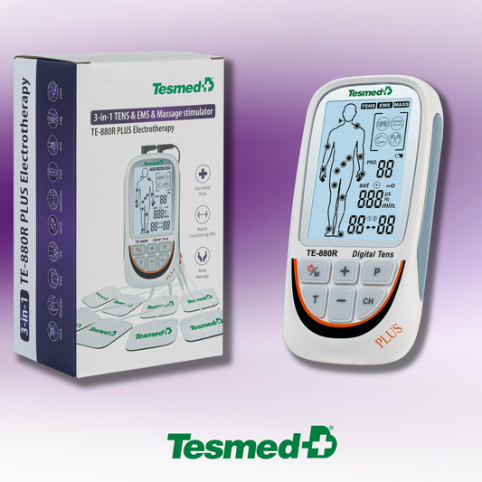 TESMED TE-880R Plus Rechargeable 3-in-1 TENS Unit EMS Muscle Stimulator & Muscle Massager, Designed for Pain Relief and Muscle Stimulation, 73 Programs, 2 Customizable, 8 Electrodes